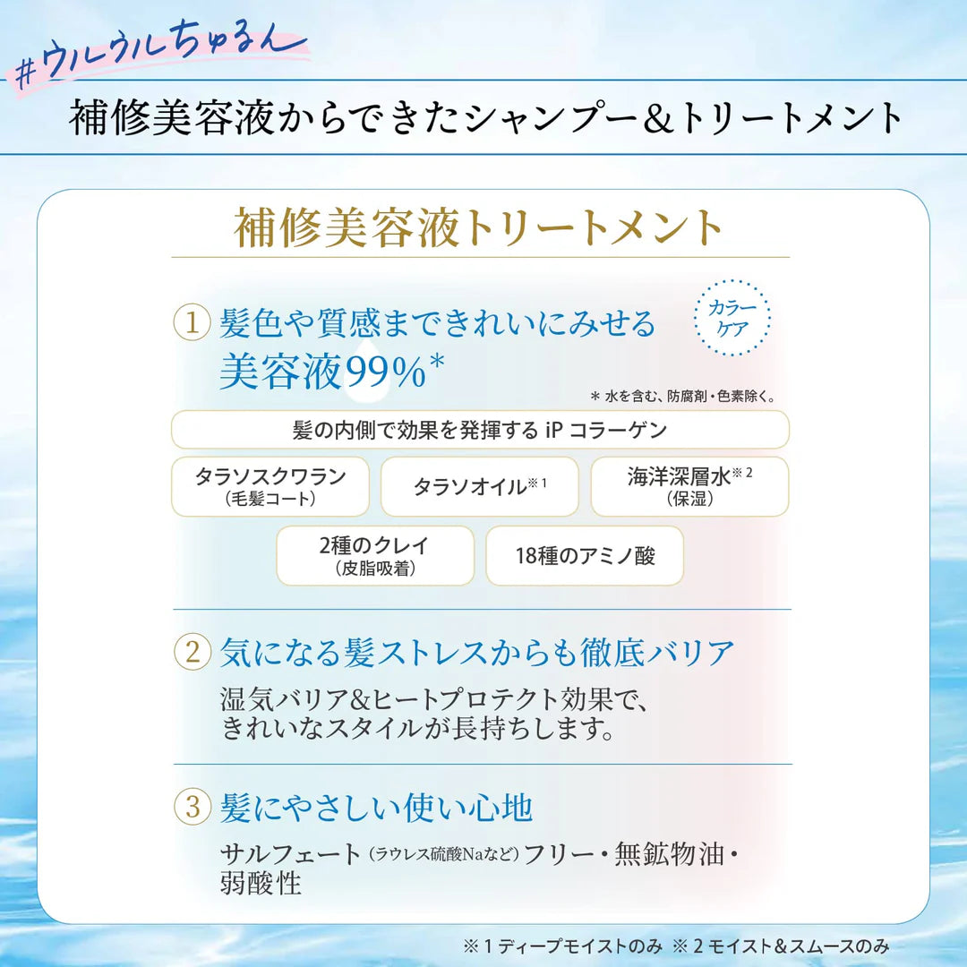 After shampooing, lightly drain the water from your hair and apply an appropriate amount of the serum. Ensure even distribution throughout the hair, then rinse well. For optimal results, it is recommended to use in combination with Joulem iP Thalasso Repair Serum Shampoo (Deep Moist). If the serum is difficult to dispense, tap the bottom of the bottle lightly before use.